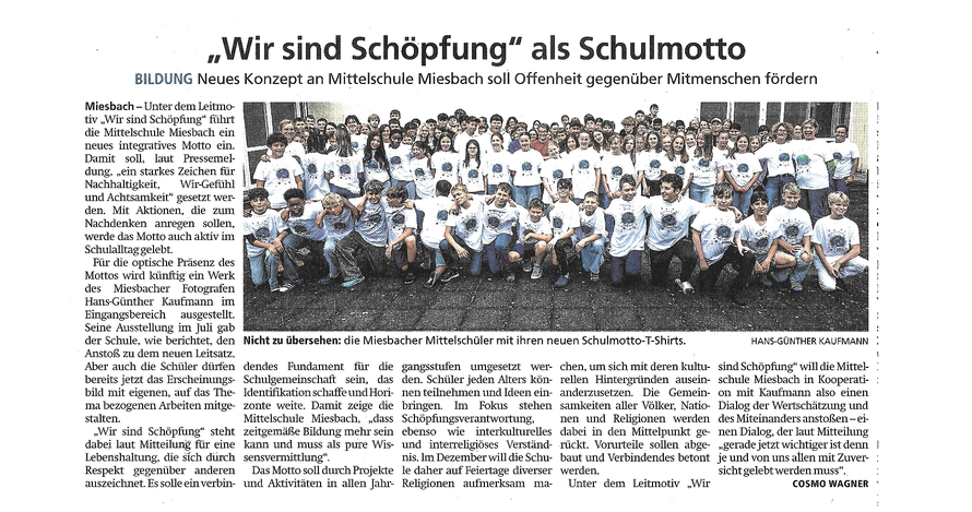Unter dem Leitmotiv „Wir sind Schöpfung“ will die Mittelschule Miesbach in Kooperation mit Hans-Günther Kaufmann einen Dialog der Wertschätzung und des Miteinanders anstoßen – einen Dialog, der gerade jetzt wichtiger ist denn je und von uns allen mit Zuversicht gelebt werden muss!